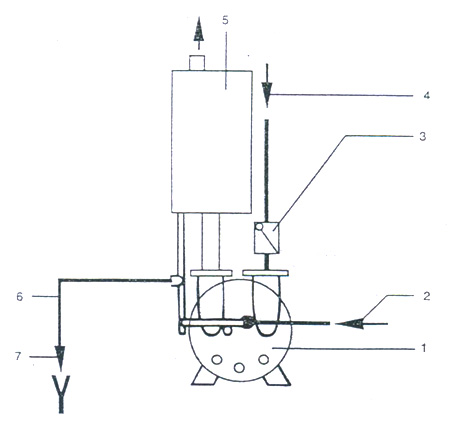 1. 2BV 真空(kong)泵 2. 供(gong)水管(guan) 3. 逆止(zhi)閥 4. 吸(xi)氣管(guan) 5. 氣水(shui)分離(li)器 6. 排(pai)氣管(guan) 7. 溢水(shui)管